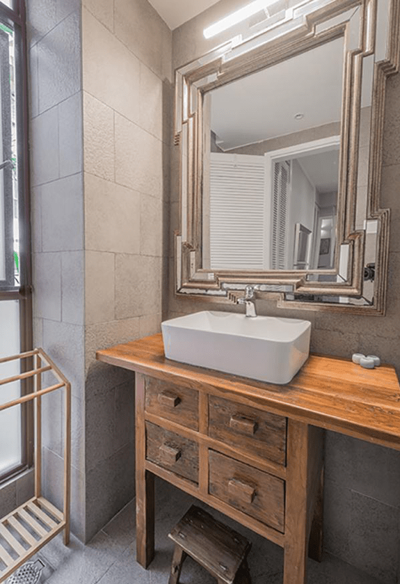 One thing we especially love in this condo’s interior is this washroom cabinet, that has become an unexpected statement piece. Many overlook functional pieces, and rooms that aren’t generally for entertaining. But this rustic piece brings life into this otherwise normal washroom while complimenting the colder stone walls that the room has been outfitted with, creating a stylish balance!