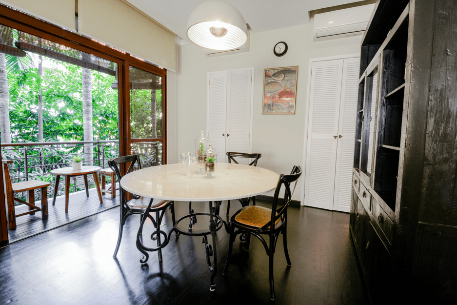 Last but not least, you could opt for earthy tones and still have your house looking amazing. The folks at Shanthi Madam, Kovalam opted to do just that. We helped them completely embraced the Scandinavian spirit by opting for mostly rustic wooden furniture to complement the sleek, white finishing of the walls and main dining table.